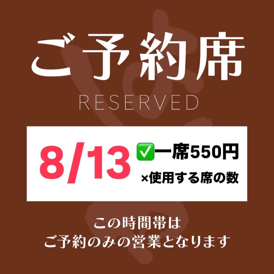 8/13【席予約権】13:00 ※飲食代は別 ◆以前と席の確保のシステムが若干変更になっております。